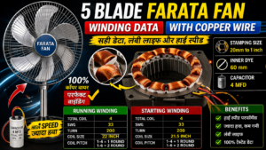 अगर आप 5 blade Farata (stand fan) की rewinding करते हैं और Copper wire में perfect result चाहते हैं, तो यह data आपके लिए बहुत useful है। यह fan high speed और strong air delivery के लिए use होता है, इसलिए इसकी winding बिल्कुल balance और सही pitch में होनी चाहिए।